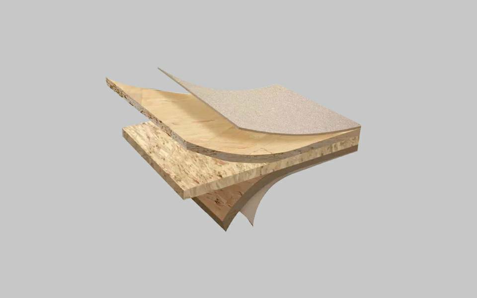 采用连续平压方式纵横交错多层结构定向铺装,板坯在高温和高压的同时作用下一体成型,因而具有很高的稳定性。MDI生态胶与木材分子反应后生成牢固而不可逆的新化学键,高效粘结板体,生产出坚固而强韧的LSB高能家居板,因而具有优异的握钉力和抗变形能力。